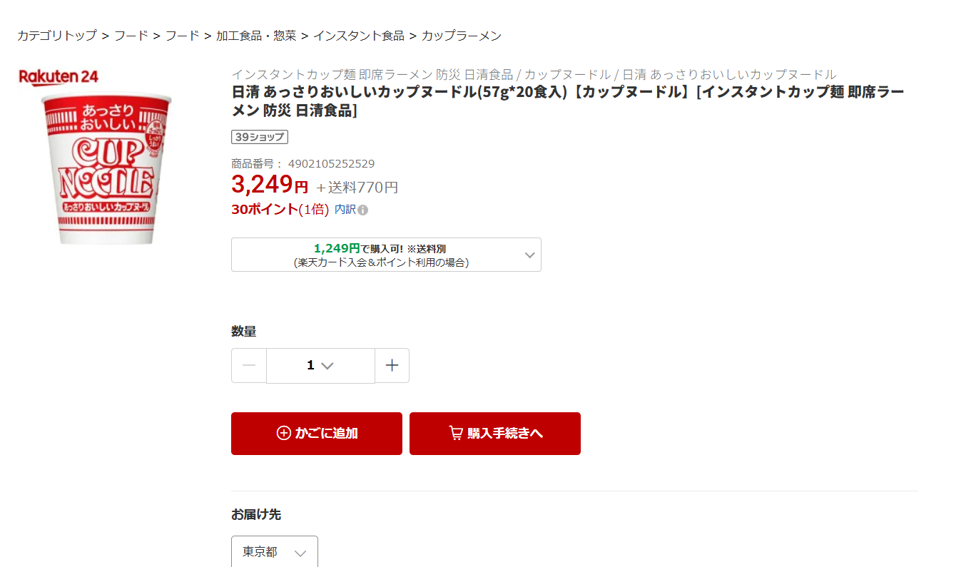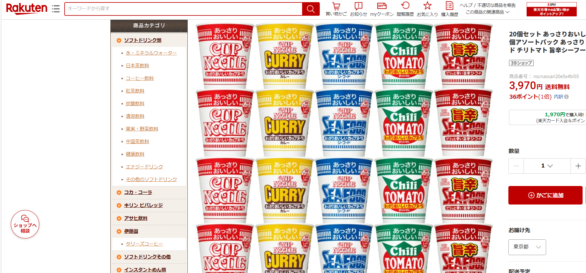 あっさりおいしいカップヌードルは楽天市場でも販売されています。