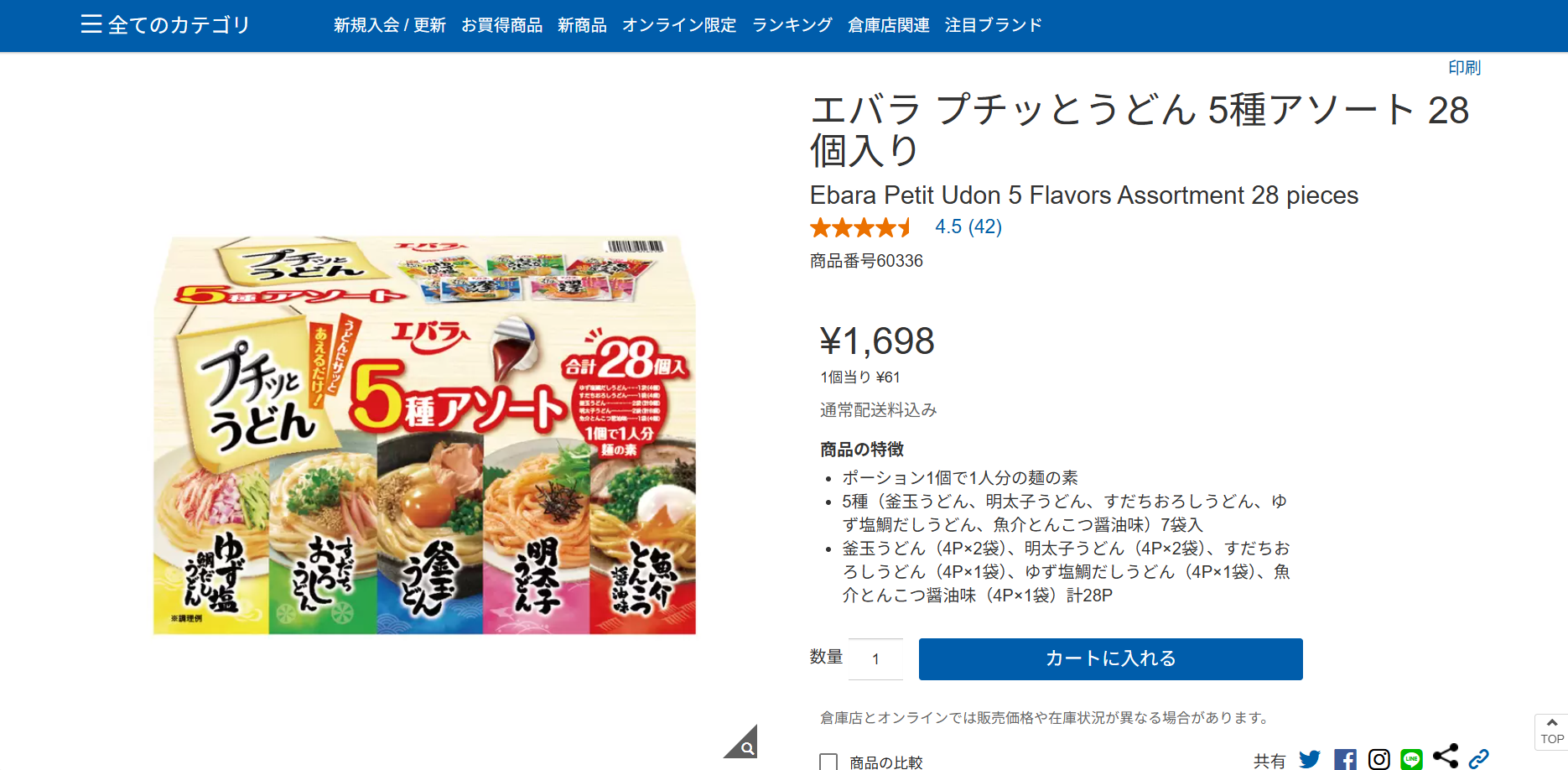 コストコオンラインと同じように、アソートのものや、1種類まとめ売りのものなど自分に合った物を手軽に購入することができます。
