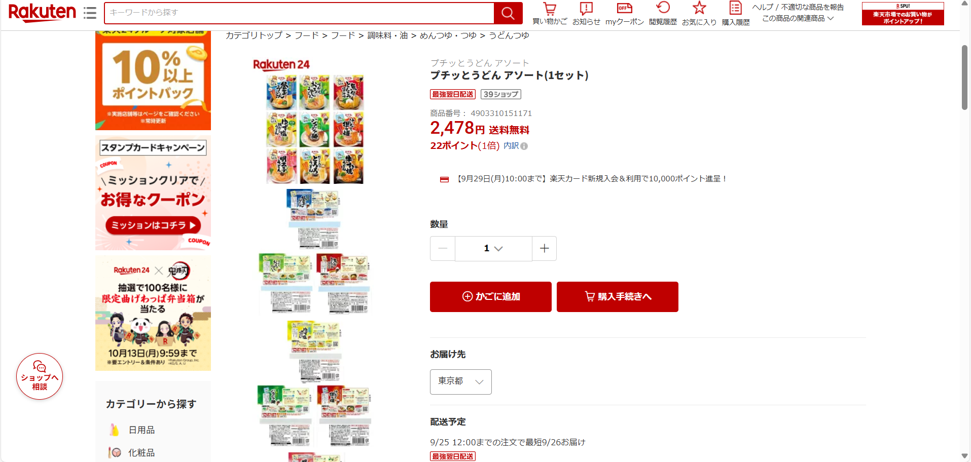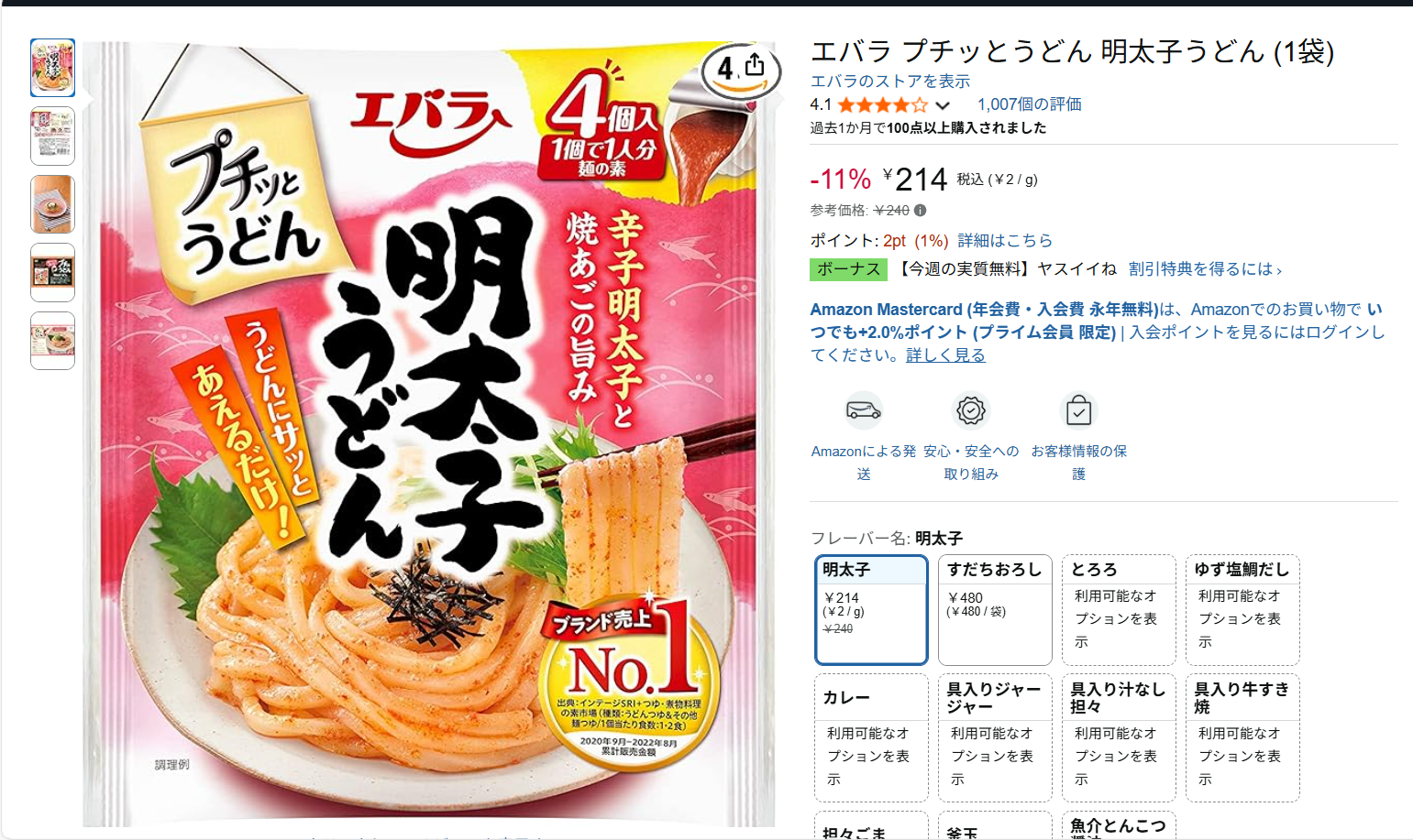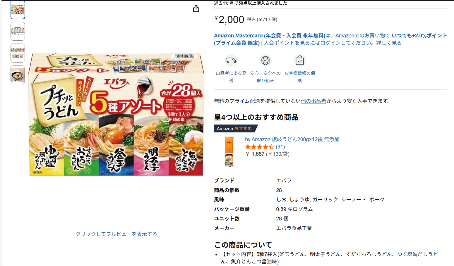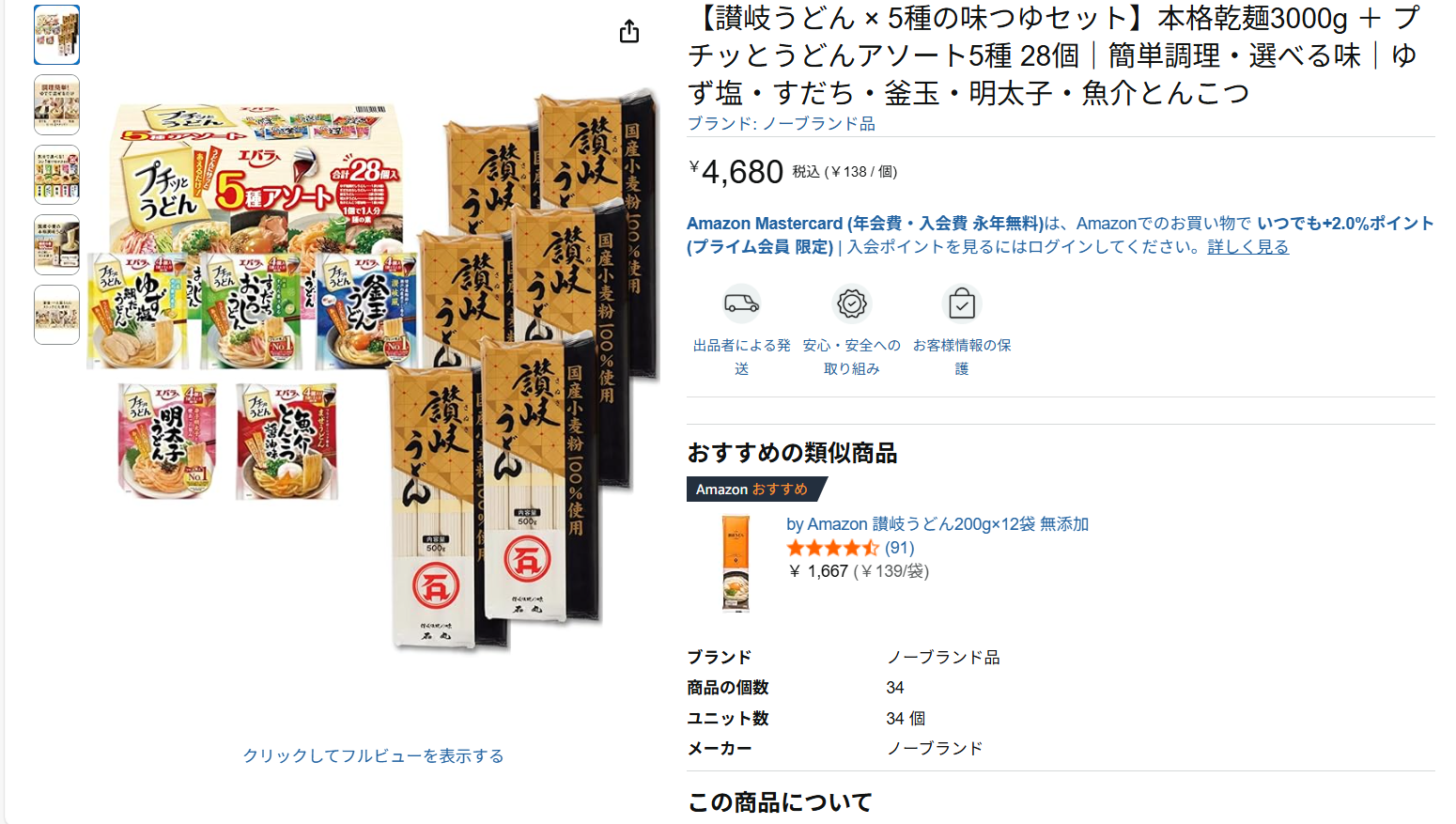 楽天市場と同様にアソート仕様のものや、1種類まとめ売りのもの、うどんとセットになっているものまでありました!